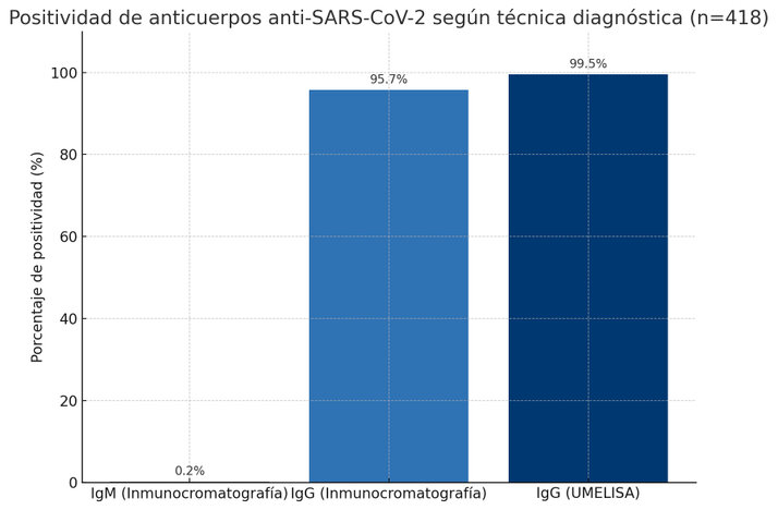 Figura 4. Porcentaje de positividad para anticuerpos IgM e IgG en trabajadores del IPK tras el refuerzo con SOBERANA 01, evaluado mediante inmunocromatografía y UMELISA (n=418).