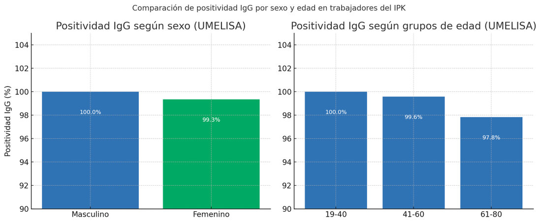 Figura 5. Comparación de la positividad de IgG según sexo y grupos de edad en trabajadores del IPK tras refuerzo con SOBERANA 01. No se observaron diferencias estadísticamente significativas en ninguno de los grupos (p>0,05).