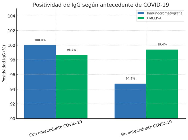 El ensayo inmunocromatográfico detectó IgG en el 95,7% de los participantes, mientras que UMELISA alcanzó el 99,5%, confirmando su mayor sensibilidad. Ambos métodos mostraron elevada especificidad, dado que la positividad se observó exclusivamente en individuos vacunados, sin evidencia de reactividad inespecífica.