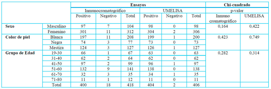 Con el ensayo UMELISA SARS-COV-2 IgG, 304 (76%) mujeres fueron positivas a IgG, 199 (50%) fueron de color de piel blanca, predomino de 51 a 60 años 138 (34,2%) (p>0,05) sin significación estadística entre positivos y negativos con el anticuerpo IgG.