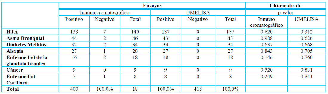 En la tabla 4 y figura 6 se muestra que los antecedentes patológicos personales analizados con los ensayos inmunocromatográfico y el UMELISA SARS-C0V-2 (P>0,05) no hay diferencia entre los que dieron positivos y los negativos en cuanto al anticuerpo IgG, lo que significa que los APP están balanceados respecto a los resultados de ambas pruebas.