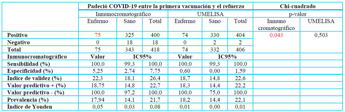 Respecto al antecedente de COVID-19 entre la vacunación inicial y el refuerzo, con el ensayo inmunocromatográfico 75 trabajadores (18,9%) resultaron positivos, con diferencias estadísticamente significativas entre positivos y negativos (p<0,05). Con UMELISA, 74 (18,2%) fueron positivos, sin significación estadística (p>0,05). En Milán (Italia), tras refuerzo con BNT162b2, el 19% de los trabajadores había enfermado entre la primera vacunación y el refuerzo; la positividad IgG fue del 99%, asociándose a menor riesgo de COVID-19 sintomático.