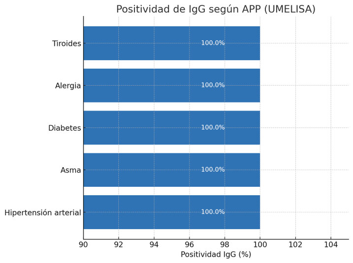 Figura 6. Porcentaje de positividad de IgG tras refuerzo con SOBERANA 01 en trabajadores del IPK según antecedentes patológicos personales (APP), evaluada mediante UMELISA. No se observaron diferencias estadísticamente significativas (p>0,05).