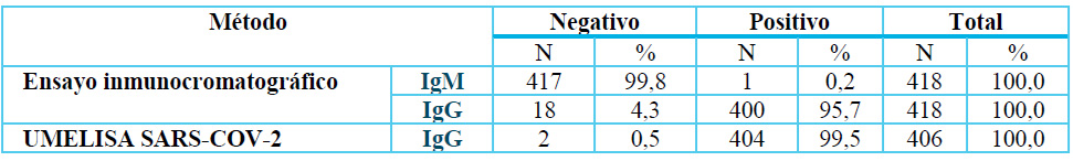 En la Tabla 2 y Figura 4 se muestra la frecuencia de anticuerpos anti-SARS-CoV-2 en trabajadores del IPK posterior a la reactivación. Mediante el ensayo inmunocromatográfico se obtuvo que la IgM solo fue positiva en 1 caso, el cual no va a ser objeto de análisis en este estudio, por el contrario, la IgG tuvo más resultados positivos 400/418 (95,7%) al igual que el UMELISA SARS-COV-2 IgG, 404/406 (99,5%).